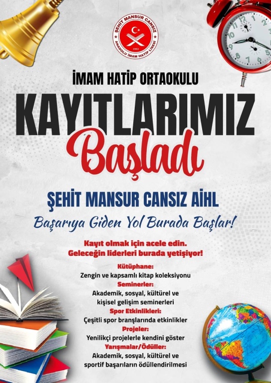 Milli ve manevi değerler ışığında geleceğin öncülerini yetiştirmeyi amaçlayan Şehit Mansur Cansız Anadolu İmam Hatip Lisesi, ortaokul kayıtlarına başladı. “Hangi Projesi?” kapsamında yürütülen akademik, kültürel ve dini etkinliklerle öğrencilerimizin hem zihnen hem ruhen gelişmelerini destekliyoruz. Kur’an-ı Kerim, Siyer, İlmihal ve temel dini bilgilerle öğrencilerimize sağlam bir dini altyapı kazandırırken; sosyal faaliyetlerle de özgüvenli ve donanımlı bireyler yetiştirmeyi hedefliyoruz.